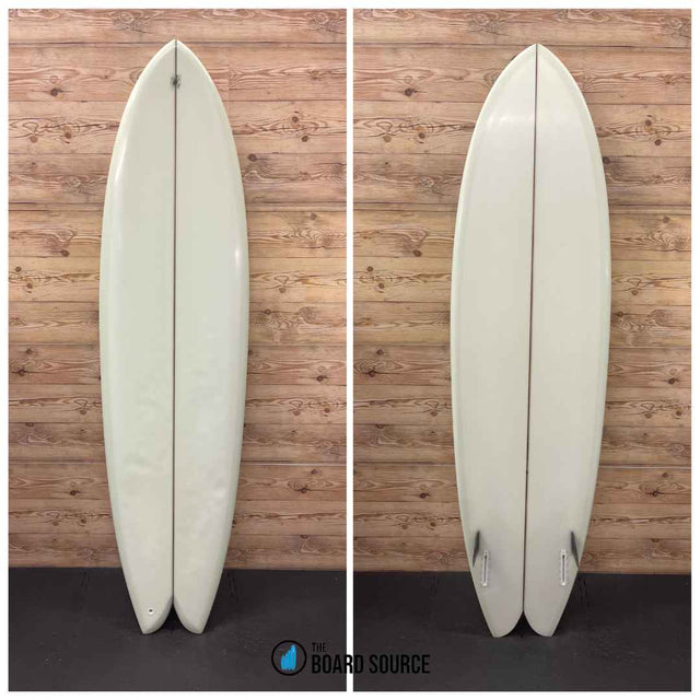 Condition: Great condition with mild deck pressures at the tail of the board. A couple of of light cosmetic cracks in the top coat on the deck at the stringer. Some professional repair to the glassed on twinzer fin  and the rear of the fin box.