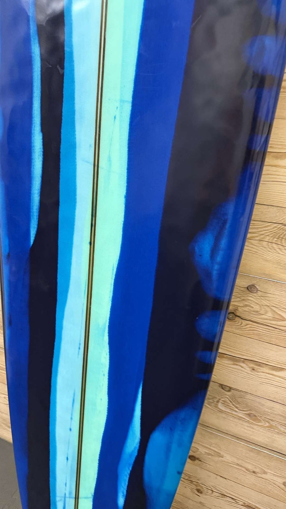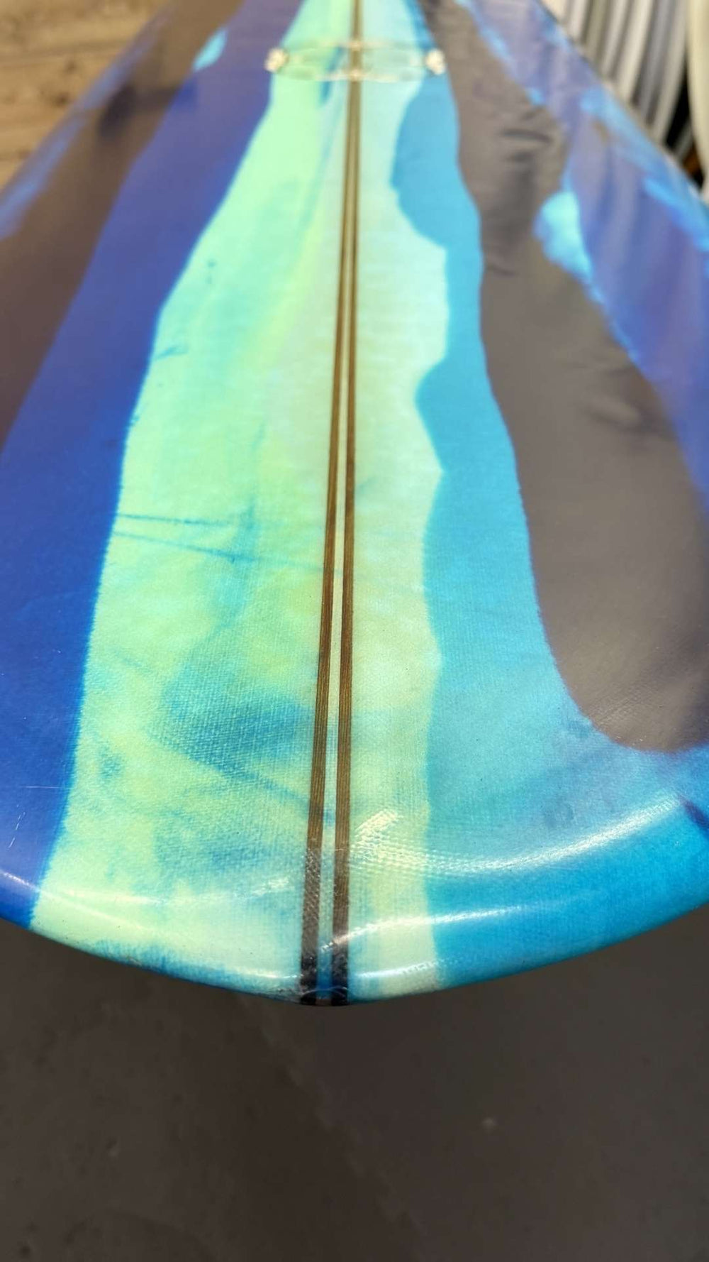 Condition: Good condition with moderate deck pressures. There is some moderate compression on the deck at the tip of the nose. A few small pressures ones on the bottom. Some small shatters under the top coat along the stringer on the deck. A few cosmetic shatters under the glass on the rails. A few mild cosmetic scuffs/scratches to the finish. Some mild cosmetic patina on the bottom
